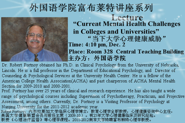 12月2日(本周五)下午4:10,在中心教学楼328室,外国语学院邀请到美国内布拉斯加大学临床心理学博士、教育心理学系教授、心理健康咨询中心主任Robert Portnoy来BB贝博做“当下大学生心理健康威胁”的主题讲座;