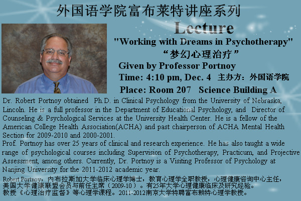 12月4日(周日)下午4:10,Dr. Robert Portnoy将在良乡校区做有关心理治疗的主题讲座。