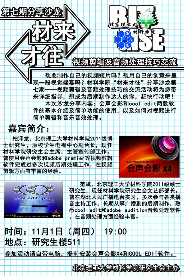 想要创作编辑自己心仪的高清视频、DV影片吗?想要精彩而有创意的记录美好时刻吗?想用Cool Edit为音频“绘画”程序吗?材料学院“材来才往”分享沙龙第七期——“材料好声音”视频剪辑及音频处理技巧交流将为您带来详细指导,想成为视频、音频达人吗?那就赶快行动吧!