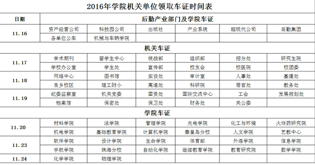 3、自11月16日起,各单位到校园停车管理办公室(菜市场北门对面)进行交费并领取2016年停车证。各单位领取车证时间安排如下:(详见附件)