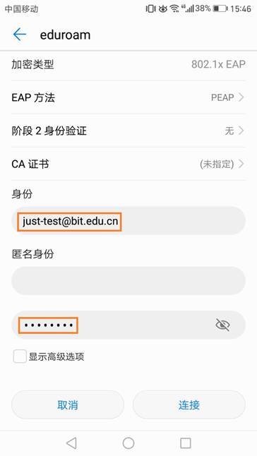 2、安卓系统在认证页面中输入“身份”和“密码”。“身份”是本人在校上网账号加学校域名后缀,如just-test@bit.edu.cn,“密码”是对应账号的上网密码。其他地方均无需配置,如图2所示。
