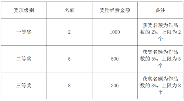 1.本次比赛分类别设置一、二、三等奖若干,发放荣誉证书并给予奖励,奖励标准见下表: