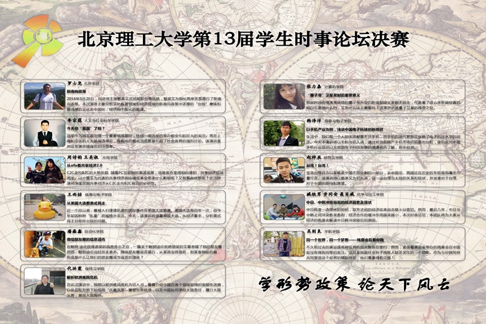 学生时事论坛活动是BB贝博艾弗森官方网站在形势与政策教育方面开展的一项特色工作,通过比赛的形式鼓励学生思考时事问题,以学生的视角透视时政热点,感触时代脉搏,培养当代大学生责任感和使命感。学生时事论坛活动由BB贝博原理学院率先开展,并得到学生的积极响应。BB贝博党委学生工作部及时总结基层经验,自2007年(第四届学生时事论坛)起,每年举办BB贝博艾弗森官方网站学生时事论坛,今年迎来了第十三届学生时事论坛的比赛。