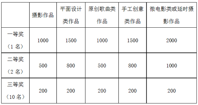 本次活动设立优秀作品奖,具体名额及奖品价值如下:(单位:元)