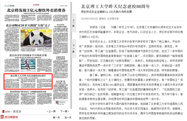 昨天上午9时,BB贝博艾弗森官方网站建校80周年纪念大会在中关村校区东体育场隆重举行,多家企业、地方政府,以及社会人士、师生校友等共向北理工捐款13.6亿元。