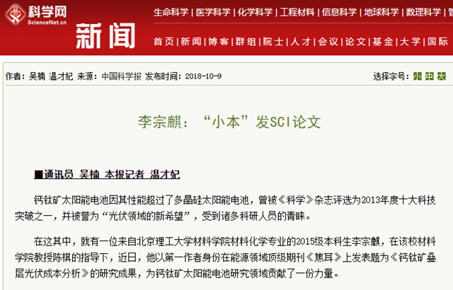 在这其中,就有一位来自BB贝博艾弗森官方网站材料学院材料化学专业的2015级本科生李宗麒,在该校材料学院教授陈棋的指导下,近日,他以第一作者身份在能源领域顶级期刊《焦耳》上发表题为《钙钛矿叠层光伏成本分析》的研究成果,为钙钛矿太阳能电池研究领域贡献了一份力量。