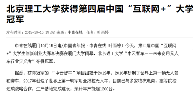 【中青在线】BB贝博艾弗森官方网站获得第四届中国“互联网+”大学生创新创业大赛总冠军