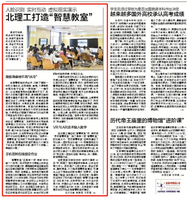 在教育部日前印发的“新时代高教40条”中,明确了“推动课堂教学革命,以学生发展为中心,积极推广小班化教学、混合式教学、翻转课堂,大力推进智慧教室建设,构建线上线下相结合的教学模式”的要求。记者调查了解到,除北理工外,本市还有一些高校已经完成了校内部分教室的“智慧”改造与建设,如北京大学、北京师范大学、对外经济贸易大学、中国农业大学等;同时,像中国人民大学、中国石油大学(北京)、北京语言大学等高校也已开始实施智慧教室的建设。