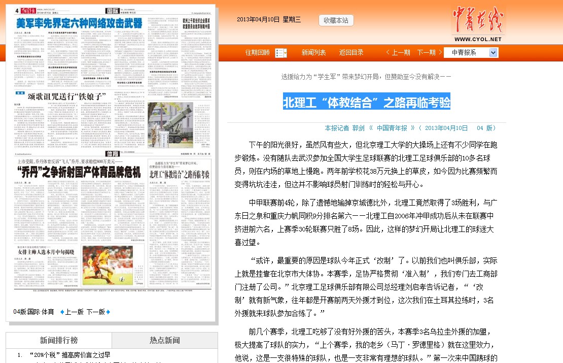 老帅金志扬曾向记者描述过他很想看到的一个场面:低级别联赛中有一半球队来自大学校园,“只有校园足球真正发展起来了,中国足球才有收获,否则还是老样子。”但在北理工冲甲之后,有过乙级联赛决赛阶段比赛经历的三峡大学和山东大学均“功亏一篑”,至今为止,仍然只有北理工独行在这条“体教结合”的坎坷道路上,并不得不开始借助职业球员的力量来帮助球队摆脱年年身陷保级圈的尴尬。