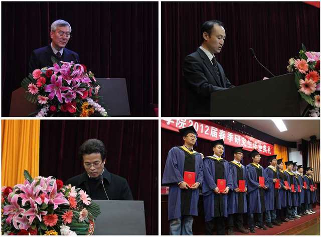 党委书记张英(左上)首先代表学院向2012届毕业研究生表示了衷心地祝贺,并对毕业生们送上四句话:第一,理智的自信,能带来走出困境的动力。第二,脚踏实地的“做”比什么都重要。第三,学会感恩,情商比智商更重要。第四,诚实守信,团结互助,严于律己,宽以待人。张书记希望毕业生们能够带着自信,脚踏实地的去实现自己的理想和抱负,不断提高自己的情商,争做国家需要的栋梁之才。副院长左正兴(右上)宣读了对2012届研究生准予毕业和授予学位的决定。常务副院长唐水源(左下)宣读了获得BB贝博艾弗森官方网站优秀毕业研究生名单。主席台领导们为获得优秀毕业研究生的同学们颁发了获奖证书。