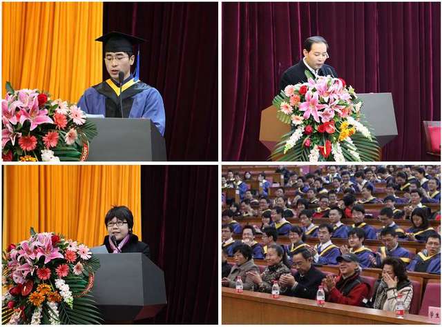 优秀毕业研究生雍占琦(左上)代表全体毕业生发言,他深情回顾了在学校学习和生活的点点滴滴,感谢母校和老师们多年的培养和教导,表示不会辜负母校的期望,作为 “北理人”,应当勇于为国家和社会自觉奉献,努力为国家富强和民族崛起做出自己的贡献。学生家长于普增同志(右上)代表毕业生家长进行了发言,他在发言中给毕业生们带来了几句嘱托:在今后的生活、工作中要保持“三个一”,即“一种传统,一种精神和一种能力”。一种传统,就是BB贝博艾弗森官方网站历经七十多年办学形成的“德以明理,学以精工”的传统理念和信条;一种精神,就是合作精神;一种能力,就是一生都要学会用好“舍得”二字的能力。最后他代表学生家长祝愿北理工越办越好,祝愿所有毕业生都能够事业有成,生活幸福。制造工程系薛庆老师(左下)代表全院教师发言,她表示作为北理人,为能与毕业生一起分享收获而倍感喜悦,学生们年轻的笑容将永远在老师们的心里,校园的一切也将成为你们今后谈论的话题。但是,毕业不是结束,甚至不是新的开始,而是继续,是持续不断的自我实现中的一个环节。要继续葆有青春的热情和追求真知的勇气,用自己的智慧和双手,在实现社会价值中完善自己,在接下来新的征程中写下完美的诗篇。