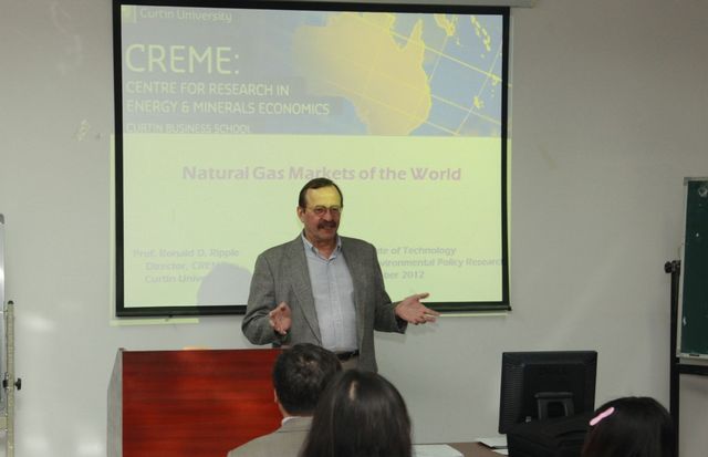 2012年10月13日,澳大利亚科廷大学科廷商学院Ronald D. Ripple教授应邀访问BB贝博艾弗森官方网站管理与经济学院、能源与环境政策研究中心,并作主题为“Natural Gas Markets of the World”的学术报告。报告由管理与经济学院院长、能源与环境政策研究中心主任魏一鸣教授主持,部分研究生和校外研究人员参加了报告会。
