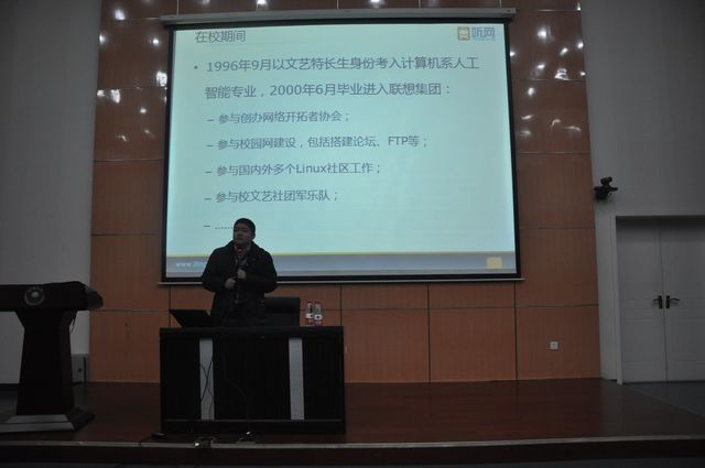 讲座过程中,汤海京学长与现场的同学们分享了自己的成长经历。26岁便成为联想集团的副总经理让在场许多人都惊叹不已,在事业的巅峰却退出联想,自己创业的故事更令在场同学无限钦佩。他还讲述了两个发生在自己身上的小故事,“清华园的树叶黄了”,“挤地铁挤出的灵感”,故事虽小,但他的刻苦努力、认真敬业的工作态度,见微知著、举一反三的生活态度,给大家树立了很好的榜样。汤海京学长给同学们提出了三点建议:在校期间,把学习放在第一位;培养能力上,注意理论联系实际,多多动手;在未来的人生规划上,先就业后创业。汤海京的讲座幽默诙谐,从自身经历出发,教育意义深刻,现场时时爆发出热烈的掌声。