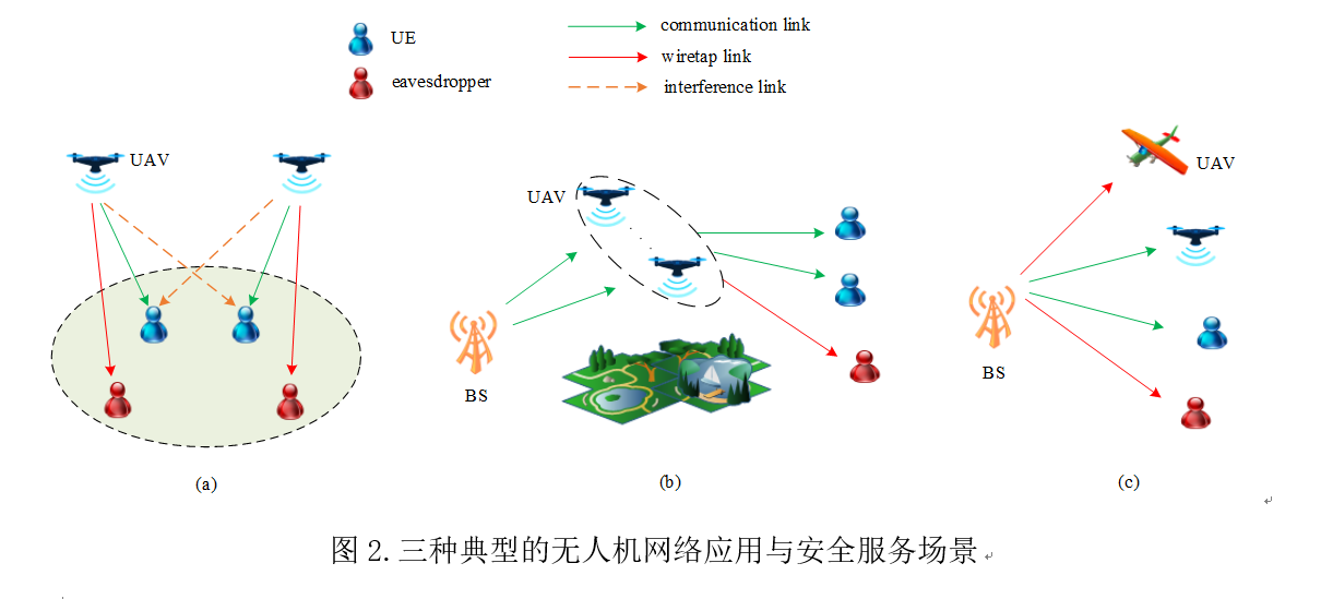 无人机搭载的无线通信网络是一个动态的分层网络,其传输的数据易受未授权用户的窃听,因此安全传输是一个重要课题。该研究团队引入了三种典型的无人机网络窃听场景如图2所示。(1)在无人机辅助基站覆盖场景中,通过部署无人机平台充当移动的空中基站,并辅以现有的网络架构进行无线信息传输,可以实现无线网络覆盖区域的快速移动;(2)无人机可作为空中移动中继为远距离用户或用户群之间提供无线连接;(3)无人机可作为空中用户与地面用户共存,支持物联网的应用,特别是航空货运服务(如亚马逊Prime Air和谷歌Wing项目)。