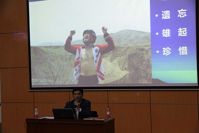 李辉先生首先讲述了自己与疾病作斗争并成功走出阴影的艰难历程。并回忆其为鼓励和帮助更多被疾病阴影困扰的人,不顾亲友反对,带着三枚心脏支架,自滨州出发,穿越鲁、豫、陕、甘、宁、青六省区,11天半顽强骑行2155公里,爬高11121米,完成了从黄河三角洲到青藏高原的挑战极限——千里走单骑,并根据自己亲身经历完成了《生命的骑迹》一书。最后,李辉先生分享了自己在骑行途中的经历与感悟,并告诫在场师生“没有比心更高的山,没有比腿更长的路”。