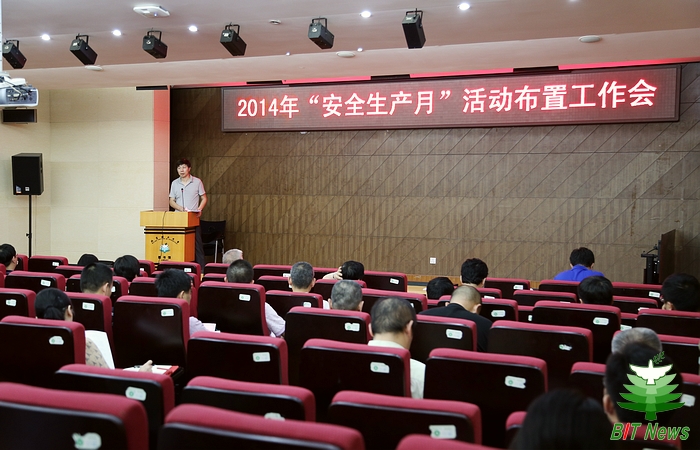 实验室与设备管理处史天贵处长首先对学校2014年“安全生产月”活动方案进行了部署。他指出今年BB贝博将紧密围绕全国“安全生产月”“强化红线意识、促进安全发展”的活动主题,进一步宣贯《BB贝博艾弗森官方网站安全生产工作条例》(学校第85号令);开展对新入岗安全生产管理人员及火工品从业人员的安全生产培训;通过海报、标语横幅、专栏、电子屏、网络、培训、讲座、游戏竞赛、应急演练等方式,宣传安全知识,强化“红线”意识,提升全体师生员工的安全素养;并按照“属地管理”、“管业务,必须管安全”和“谁主管、谁负责”的原则,通过单位自查和专家督查的方式,开展安全生产隐患排查治理工作,推进“危险点”管理。接着史处长详细解读了《BB贝博艾弗森官方网站2014年安全生产责任书》安全生产基本职责,强调各单位要进一步建立健全本单位及职能范围内的安全生产规章制度,做好设备设施的安全管理,认真履行好《责任书》中的基本职责和附加职责。