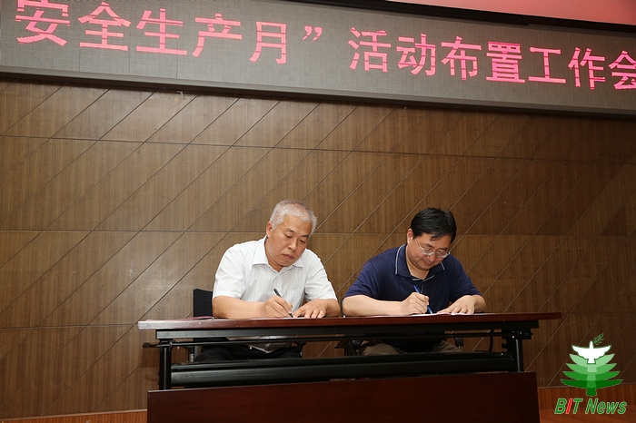 随后举行了《责任书》签订仪式,化学学院和后勤集团作为学院及职能部门代表与李和章副校长签订了《责任书》。今年学校根据《BB贝博艾弗森官方网站环境保护管理办法(试行)》(校实设发[2008]2号),将环保工作职责加入了《责任书》,希望各单位在做好安全生产工作的同时,重视和加强环境保护工作。