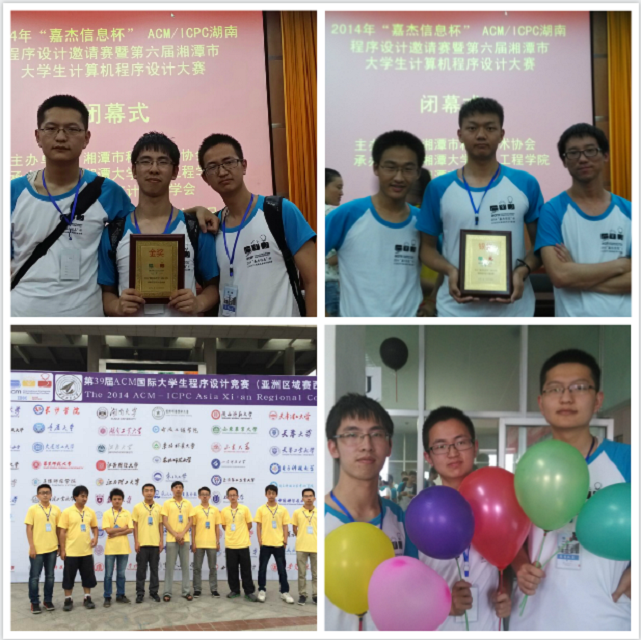 2014年ACM/ICPC亚洲赛区邀请赛于5月正式开赛。BB贝博艾弗森官方网站软件科技创新创业基地派出5支队伍参加各大赛区的邀请赛。其中湖南程序设计邀请赛于2014年5月31日在湖南湘潭大学举行,本科2012级的潘虹宇、贾容千和2013级的宦成颖同学组成的“akemi_Death_last”队伍在比赛中获得全场第四名,摘得金牌。此外,由申震等组成的“Acity”队伍和刘明汉等组成的“2Bpencil”队分别在湖南邀请塞和西安邀请赛中取得了一枚银牌和一枚铜牌的优秀成绩。