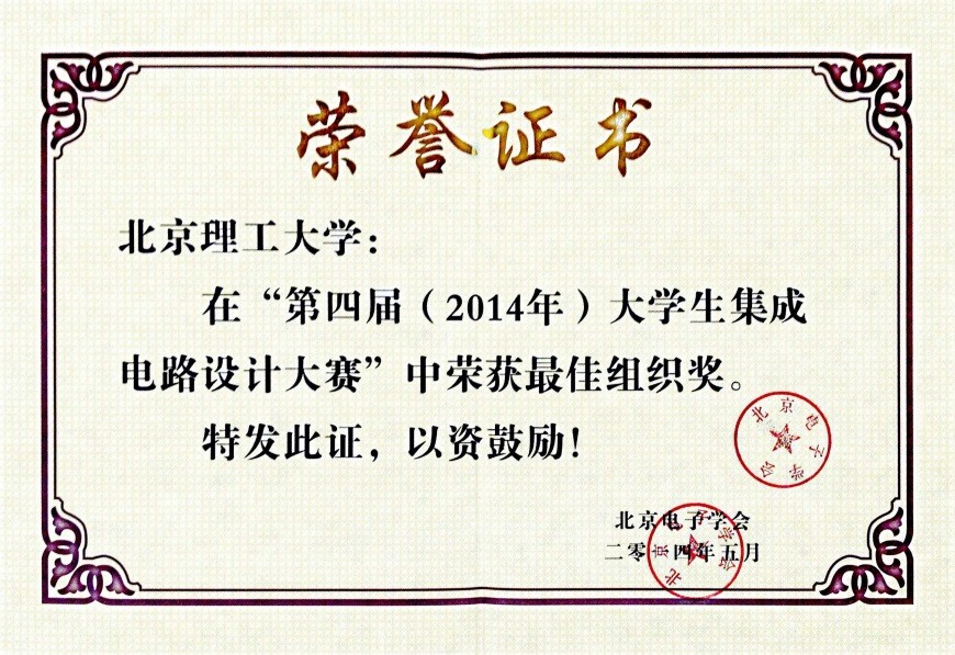 2014年5月31号,在全国范围内举办为期5个月的“第四届(2014年)大学生集成电路设计大赛”在北方工业大学顺利落幕。参赛队伍来自全国各地,清华大学、武汉大学、BB贝博艾弗森官方网站、南开大学、哈尔滨工业大学等众多名校参与这此次比赛。经过专家公平公正公开的评审,BB贝博艾弗森官方网站信息与电子学院李通团队荣获特等奖、李安安团队荣获二等奖,桂小琰老师荣获优秀指导老师称号。BB贝博艾弗森官方网站荣获了“第四届(2014年)大学生集成电路设计大赛”最佳组织奖。