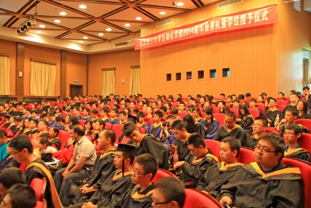 典礼由2010级本科生辅导员潘佳奇主持。首先,自动化学院院长兼党委书记王军政教授代表学院致辞,他对学院2014届圆满完成学业的258名本科生、55名硕士生、17名博士生顺利毕业表示热烈祝贺,对为培养学生付出辛勤劳动的学院教师们表示衷心的慰问,对关心关怀学生成长和支持学院各项工作的学生家长和校友们表示衷心的感谢!王院长也对即将毕业的同学们提出了几点期望:一是永远保持高尚的品德。要有社会责任感和良好价值观,要有报效祖国感恩父母的爱心,要有勤奋刻苦努力拼搏的决心,要有坚持不懈实现理想的信心。二是不断追求卓越的才能。在今后工作中继续学习不断提高自己获取新知识的能力,深入思考不断提高自己工作创新的能力,统筹兼顾不断提高自己组织管理的能力。三是要具有团结协作的意识。工作生活中多与他人交流、沟通,具有良好的团队协作精神,少考虑一点个人得失,多为集体和他人着想。四是要坚持体育锻炼。要想使自己的人生更有价值更有意义,良好的身体和健康的心态是前提和保障。五是要具有坚强的意志。面对困难和挫折毫不气馁,努力拼搏,敢于挑战,努力实现自己的价值和远大的理想。