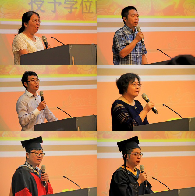 学院教师王博作为班主任代表发言。他对全体2014届毕业生表示热烈祝贺,并希望同学们在今后的人生道路上,永远不忘梦想,永远不忘拼搏,勤劳的劳作方能换来甘甜的果实。