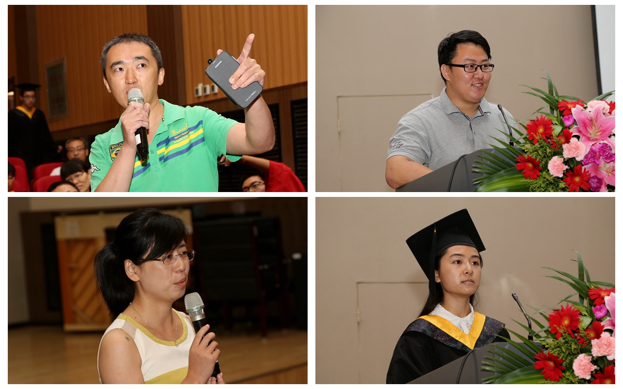 出席当天活动的教师代表也先后发言,李静波老师引用毛主席曾对留苏学生的寄语——“你们好像八九点钟的太阳一样,希望寄托在你们身上”;马壮老师表示学院将永远是学生最坚强的后盾,希望毕业生们在未来的生活和工作中遇到困难的时候能够想起老师;王扬卫老师表示学院对所有的毕业生一视同仁,无论将来是成功或者失败,学院都愿意敞开怀抱欢迎大家;王林老师、朱时珍老师、郝建薇老师也纷纷用自己朴实的语言表达了他们对于毕业生的祝贺与不舍之情,同时也为毕业生们寄予了深深的祝福。随后,由2010级5个本科毕业班制作的或幽默或感人、或深情或调侃的毕业视频调动了所有在场学生内心深处的记忆,在现场很多毕业生留下了难忘的泪水。