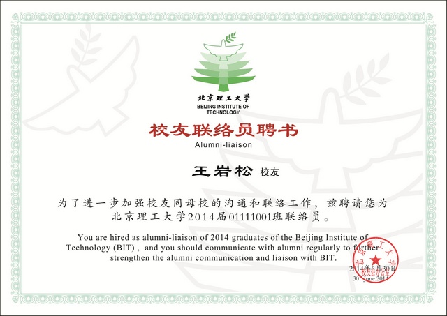 经过本人申请、学院推荐,全校共选拔了王岩松、黄爽、易璐、赵明、孙振源、梁继轩、田宏泽等201名毕业生为班级联络员,殷子明、李冰、朱幸达、曾博宇、王嬿舒等34名地区校友联络员(具体信息见链接/tzgg17/ggxx/104072.htm )。他们是BB贝博艾弗森官方网站校友工作的重要辅助力量,是广大校友与母校之间交流互动的桥梁、与工作单位所在地的校友会对接的纽带,是促进本班同学之间继续保持联系、增进感情的关键力量。