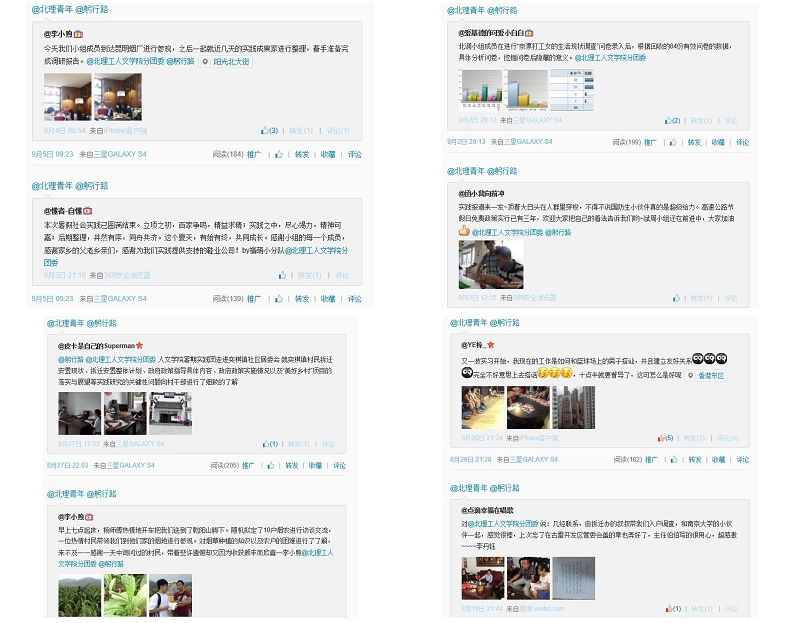 2014年人文学院暑期社会实践吸引了不同年级、不同专业共计310人次参与其中。各实践团在进行课题调研的同时,积极提交了社会实践报告、通讯、照片、视频资料等实践成果,人文学院分团委共发布社会实践相关微博95条。最终共有71个小组成功结项并参与了社会实践答辩评审。