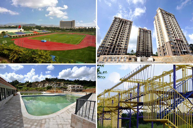 田径场翻新,为北理增添一份美景;二期教师安居工程竣工交付,共建教师公寓400套;新建游泳池;新建学生素质拓展基地,图片展示的高空自保项目为国内首套该类型设备。