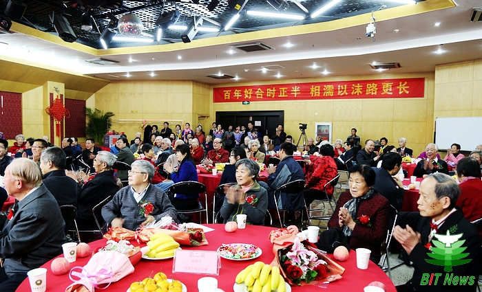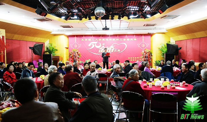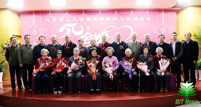 11月5日,由离退休教职工党委、离退休工作处主办的“BB贝博艾弗森官方网站2014年离退休教职工金婚庆典”在北理工国际交流中心二层多功能厅隆重举行。校党委书记、离退休工作领导小组组长张炜,副校长、离退休工作领导小组副组长杨宾、中国老龄事业发展基金会银龄关爱工程主任雷超等出席庆典仪式,与参加活动的24对金婚伉俪(另有8对未能参加现场活动)及他们原所在单位的领导欢聚一堂,共同庆祝这一美好、幸福的时刻。庆典活动由离退休工作处副处长范友联主持,杨宾宣读了2014年32对金婚伉俪名单,并向各位金婚伉俪表示祝贺。