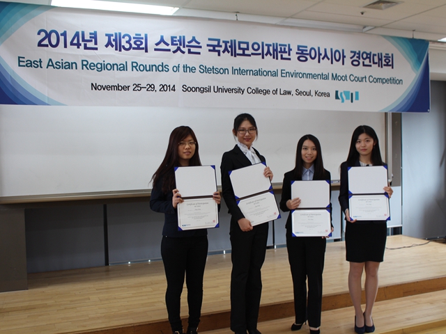 2014年11月25-29日,第19届国际环境法模拟法庭大赛(International Environmental Moot Court Competition, IEMCC)东亚地区选拔赛在韩国首尔举行。由法学院张艳丽副院长、环境法所所长罗丽教授、张晏老师带领的2011级学生张晗、张航、王蔚、王安琪、蔡文组成的BB贝博艾弗森官方网站代表队参加了此次竞赛,并取得优异成绩,王蔚同学以出色表现获得“最佳辩手”的奖项。