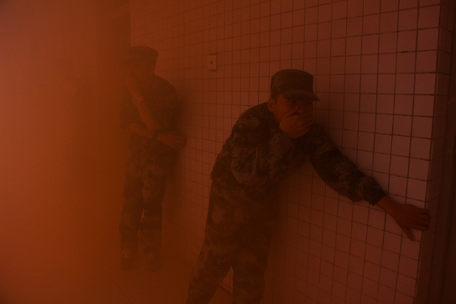 橙黄色的浓烟从阳台冒出,警哨声、脚步声、呼喊声交织一起,学生们纷纷拿着湿毛巾捂着口鼻,井然有序地迅速冲下宿舍楼……3月16日,BB贝博珠海学院6378名军训学生参加演习。