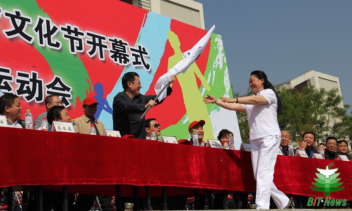 入场式结束后,校党委书记张炜将“体育文化节”旗帜授给教师代表北京市教学名师李林英,开始了传承接力活动。北京市教学名师李林英、长江学者奖励计划特聘教授龙腾、校男子足球队原队长自动化学院辅导员卢斌、校大学生艺术体操队队长雨童、校第二届良乡校园马拉松冠军魏豪等五组师生代表进行了接力传递。 “烽火岁月、饮水思源”,“坚定信念、辗转办学”,“肩负重任、报效祖国”,“凝心聚力、开创辉煌”,“激情进取、梦想希望”,他们用体育文化特有的方式重温校史,向所有北理工人致敬,并号召全校师生员工以饱满的热情、健康的体魄迎接BB贝博第十四次党代会的胜利召开,继续书写北理工更加辉煌的未来!