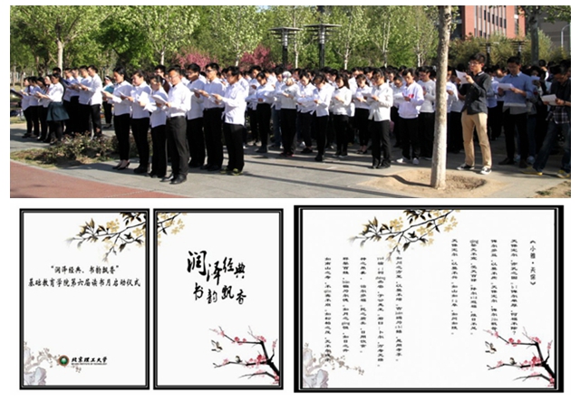 基础教育学院坚持每年举办读书月活动,今年是第六届,主题为“润泽经典,书韵飘香”,旨在通过举办读书月活动,在师生中进一步弘扬中华优秀传统文化,营造浓厚的书香校园氛围,引导师生养成阅读经典的良好习惯,在博览群书中涵养心灵、浸润思想、陶冶情操、提升境界、丰富生活,在阅读经典中深入挖掘和阐发中华传统文化讲仁爱、重民本、守诚信、崇正义、尚和合、求大同的时代价值。