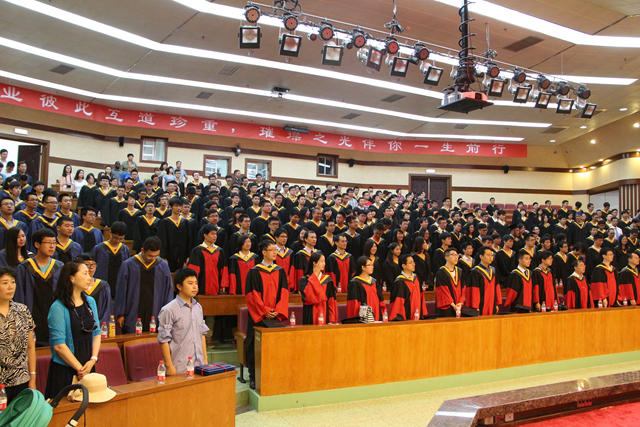 6月27日上午,光电学院2015年本科生、研究生毕业典礼暨学位授予仪式在中心教学楼报告厅举行。光电学院院长薛唯、副院长赵长明、许廷发、黄一帆、学院部分老师、家长和全体毕业生参加了本次典礼。典礼大会由学院党委副书记、副院长邹锐主持。毕业典礼在雄壮的国歌声中开始。