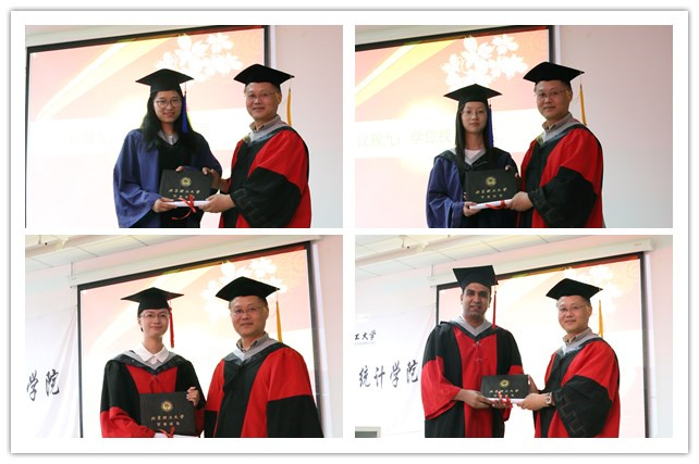 数学统计学院副院长史福贵教授宣读授予学位的决定。在悠扬的音乐声中,学院党委副书记副院长衡靖为优秀毕业生代表颁发荣誉证书。
