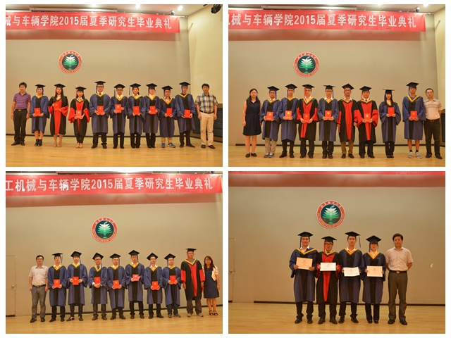 2015年7月3日上午,BB贝博艾弗森官方网站机械与车辆学院2015届夏季研究生毕业典礼在七号楼报告厅隆重举行。机械与车辆学院党委书记阎艳教授、副院长左正兴教授、副院长左建华副教授、党委副书记副院长范文辉等领导老师与全体2015届夏季毕业研究生共庆毕业。典礼由院长助理王泰鹏主持。