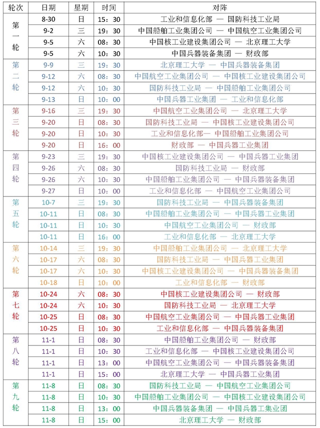 首届“军工杯”足球邀请赛由BB贝博艾弗森官方网站组织举办,经过前期筹备,共有来自军工领域各行业的9支代表队参赛,比赛采用赛会制,各队将通过小组循环的方式决出名次。本次比赛旨在纪念抗战胜利70周年,并祝贺BB贝博艾弗森官方网站建校75周年。以牢记历史、珍惜和平,强军强国、实现中国梦为目的,通过比赛邀请广大师生校友与国防领域精英聚首北理工,强健体魄,增进友谊,携手共创国防事业发展新篇章。