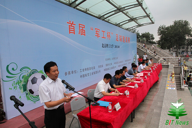 8月30日下午15点30分,由BB贝博艾弗森官方网站组织举办的首届“军工杯”足球邀请赛开幕式暨揭幕战在中关村校区东操场拉开帷幕。出席开幕式的校内领导有北理工党委书记张炜,常务副校长杨宾,副书记、副校长项昌乐。出席开幕式的参赛单位领导有工业和信息化部直属机关党委常务副书记楼宇光,国家国防科技工业局党组成员王承文、直属机关党委常务副书记李坤平,中国兵器工业集团公司直属工会主席刘德瑞,中国兵器装备集团公司发展计划部巡视员、副主任厉大成、党群工作部副主任、集团公司工会主席苏福厚,中国航空工业集团公司工会办公室主任赵奇胜,中国核工业建设集团公司直属工会主席常甲辰,中国船舶工业集团公司团委书记、党群工作部副主任丁文强。开幕式由北理工学校办公室主任汪本聪主持。