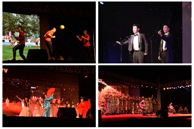 一曲激情洋溢的《渴望光荣》拉开了晚会的序幕,现场气氛欢快而热烈。富有创意的音乐歌曲《Cups》、美声合唱《斗牛士之歌》、歌曲串烧《在路上》、弹唱加合唱《当穿上军装那一刻》等歌曲类节目精彩纷呈,体现出BB贝博学子的锐意创新、充满活力;精彩绝伦、动感精湛的舞蹈节目《Shake it》再现了充满活力的军训生活;而《乱红》则别出心裁地将朗诵与歌舞巧妙地结合起来,深情的朗诵、婀娜的舞姿、空灵的笛声和悠扬的歌声异彩纷呈、惊艳四座。现代乐器串烧《天空之城》和古典乐器串烧《茉莉花》,让同学们听得如痴如醉。更有足球表演秀《足球季风》中娴熟精湛的球技,充分展现了90后大学生的青春活力,让在场观众赞叹不已。三句半《军训那些事儿》及幽默舞台剧《不正常人的正常军训》诙谐地展现了阳光活泼的军营生活,让同学们在笑声中回味了军训生活的点滴精彩。节目高潮跌宕,将汇演一次次推向高潮。