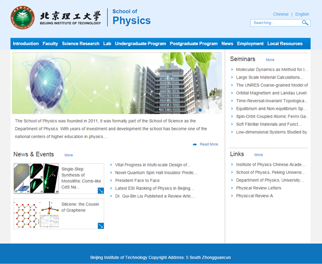 物理学院在本批次学院英文网站建设工作中积极响应,并与宣传部展开密切合作,2015年6月底,物理学院向宣传部提供了本学院的英文网站栏目意向表(10个一级栏目以及21个二级栏目),并在宣传部交付初建的网站后,自主翻译上传英语新闻63篇,其中教师一级栏目下的教师介绍达20篇,科学研究和实验室介绍达10篇,充分展示了物理学院的教学水平和科研特色。历经5个月的反复修改与精心打磨,物理学院最终确立了9个一级栏目以及20个二级栏目的网站主页,并于2015年11月中旬率先完成了学院英文网站的相关建设内容,经过学院领导审核,正式成功上线,为全校二级学院英文网站建设工作起到了较好的示范带头作用。
