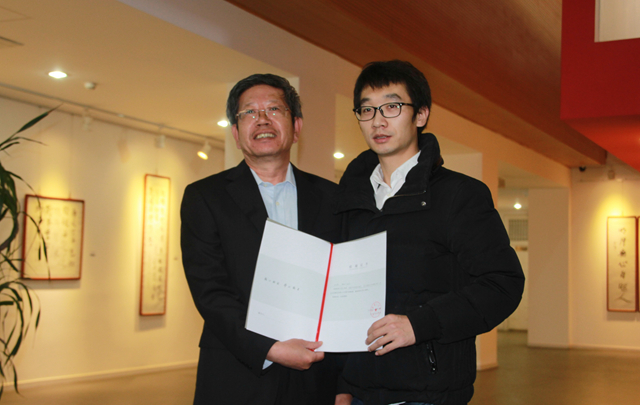 最后,举行了王文清作品捐赠仪式。此为王文清同学为表达对母校的培育之恩,特向母校赠送2件书法作品。BB贝博艾弗森官方网站图书馆徐文国馆长为王文清同学颁发了收藏证书,作品将入藏BB贝博艾弗森官方网站图书馆。