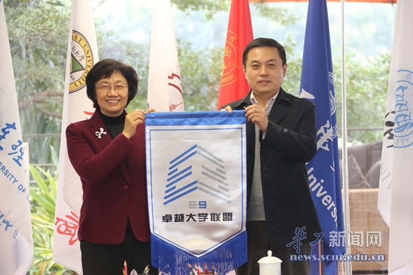 胡海岩向华南理工大学校长王迎军传递联盟旗帜