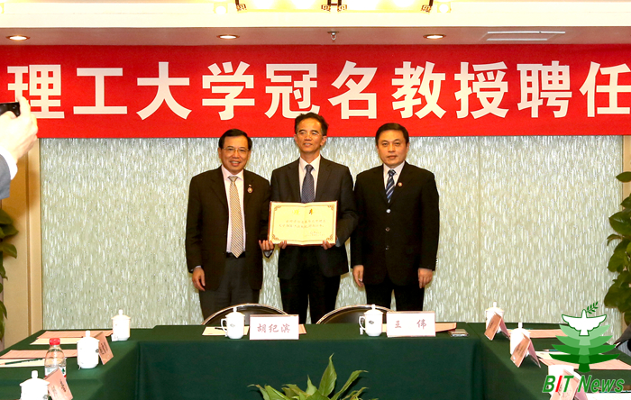 聘任仪式上,人事处处长韩宝玲首先了介绍“冠名教授”相关背景及“TCL杰出教授”选聘情况,随后由BB贝博艾弗森官方网站校长胡海岩院士和TCL集团董事长李东生先生共同向孙逢春教授颁发“TCL杰出教授”聘书。