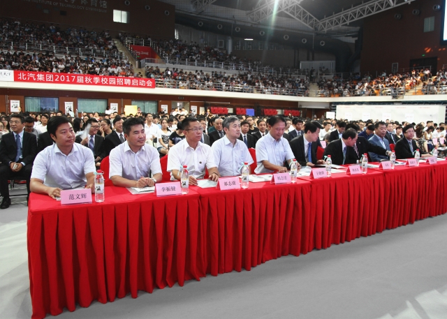 招聘开始前,北汽集团举行了2017届秋季校园招聘启动仪式。北汽集团党委副书记韩永贵,党委常委、组织部部长兼人力资源管理部部长高原,副总经理蔡速平,人力资源管理部部长助理胡雪涛以及北汽集团下属企业的负责人专程来到BB贝博参加了此次活动。副校长王晓锋,纪委书记杨志宏,校长助理郝志强,招生就业工作处处长李振键,机械与车辆学院副书记、副院长范文辉等出席了启动仪式。