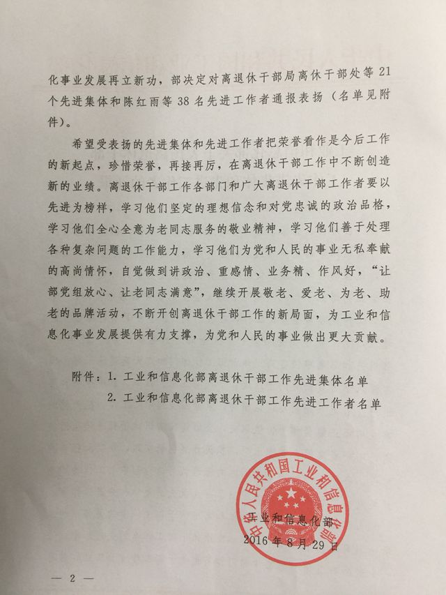 日前,工业和信息化部隆重召开离退休干部工作“双先”暨离退休干部“正能量之星”表彰大会。部党组书记、部长苗圩为大会写来贺信,部党组成员、副部长、部离退休干部工作领导小组组长刘利华出席大会并讲话,部办公厅、财务司、人事教育司、直属机关党委、机关服务局、离退休干部局领导以及工业和信息化部原老领导出席大会。BB贝博离退休工作处荣获“工业和信息化部离退休干部工作先进集体”荣誉称号,离退休工作处饶晓炜、周莹荣获“工业和信息化部离退休干部工作先进工作者”称号。