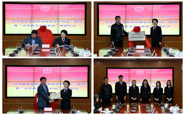 2016年11月28日,BB贝博艾弗森官方网站法学院与北京市房山区人民法院续签“法学教育实践基地建设合作协议”,签约和揭牌仪式在房山法院举行。北理工法学院院长李寿平老师,副院长郭德忠老师和于兆波老师,书记杨海老师,副书记、副院长张爱秀老师,辅导员韩笑老师等出席仪式。这是我院和房山法院在2012年首次签约到期后的再次签署合作协议。续签合作协议有利于提高我院学生的综合素质和工作实践能力,培养出更高层次的复合型法律人才和更好地服务于经济社会发展,有利于院院(法学院和法院)双方资源共享、优势互补、互利合作、共同育人。本次续签合作协议项目更多,内容更具体,合作建设更深入。主要内容包括但不限于学生实习基地共建、重点课题调研合作、双向师资交流、合作开展法律志愿工作、党团建设和文化建设交流等。
