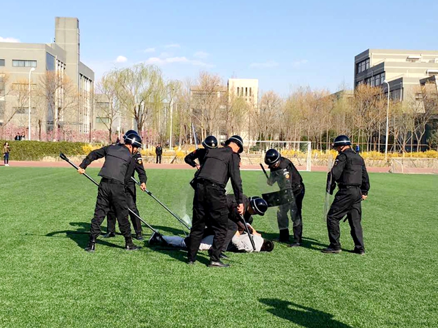 反恐防暴应急演练采用实景模拟形式,从校园巡逻人员发现可疑人员进行盘问开始,到嫌疑人挟持一名学生试图逃离,通过启动校园反恐防爆预案和联动机制,迅速通过监控技术手段监视嫌疑人动向,校区安全特勤人员迅速抵达现场,采用可控有效手段对嫌疑人进行打击,直至完成有效控制。整个演练程序完备、准备充分、一气呵成。