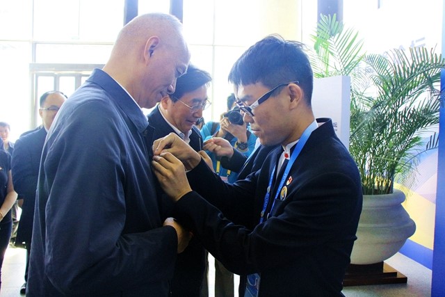 “一带一路”志愿者的辛勤付出也受到校内外各界的关注与关怀。5月13日上午,北京市委书记郭金龙,市长蔡奇一行来到各志愿者岗位亲切看望了志愿者,并表示志愿者们代表中国形象、北京形象、青年形象。在注册中心,志愿者们向北京市领导演示论坛参会人员的注册流程,BB贝博于增雨同学代表志愿者为蔡奇市长佩戴了志愿者徽标。