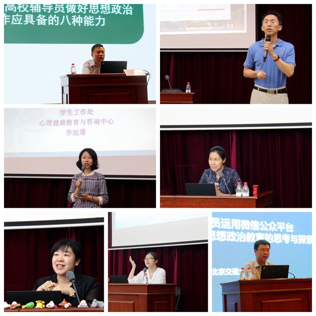 培训基地邀请了北京市委教育工委宣教处副处长寇红江、BB贝博艾弗森官方网站学生工作部部长郭彦懿、清华大学学习与发展指导中心主任、学生部副部长耿睿、BB贝博艾弗森官方网站心理健康教育与咨询中心副主任李旭珊、BB贝博艾弗森官方网站法学院党委副书记副院长张爱秀、2015-2016年度北京高校“十佳辅导员”张琪等进行主讲。